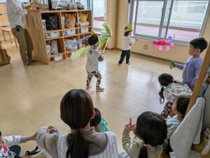 神楽を見に行ったお友達がいて、さっそく神楽の舞のまねっこ遊び...