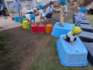 • 話ながら、どんどん桶やおもちゃをつなげていく子ども達。
