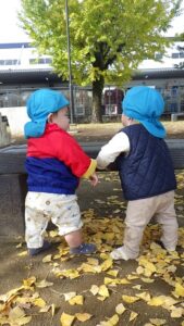 すたーくらすさん!一面に広がるイチョウの葉っぱを見ながらキョトン?「なんだコレ~」と言わんばかりに、お座りしながら触って見たり、出来るようになったばかりのつかまり立ちをしながら見てみたり…と不思議そうに感触を確かめていましたよ☆これからも先生たちと一緒に、この季節ならではの遊びを楽しんでいこうね~!