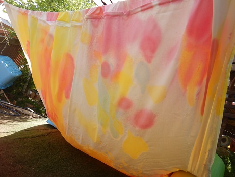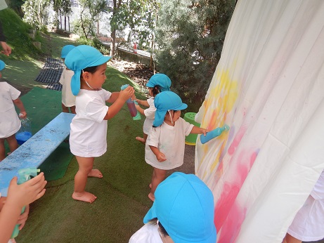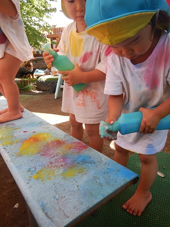 先週の晴れの日。スプレー遊びを楽しみました♪色水を入れた霧吹きスプレーをギュッと握って噴射~!!手に力を入れてできたかな?白い布がカラフルに変身しましたよ~(^▽^)/