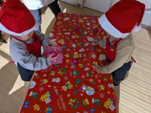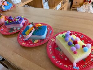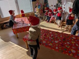 毎日、クリスマスイベントを開催している、あーすくらすさん!!先日は、サンタ帽&先生の手作りエプロンを着て、お買い物ごっこを楽しんでいましたよ♪商品は、布の端切れを使って作ったスポンジケーキや粘土で作ったクリスマスオーナメントなどなど…🎄お店屋さんとお客さんのやりとりも上手になりましたよ~(⌒∇⌒)