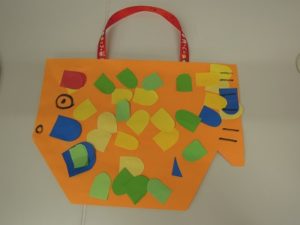 魚のバックに色のウロコを貼って楽しみました。几帳面に貼る子、ウロコを
