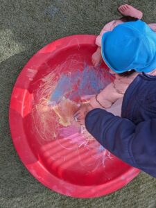 あーすくらすさんが、テラスで、のびのび~と自由に描いていましたよ♪手についた粉を使って、手形をつけてみたり、濡れているところにあえて描いて色の混ざりを楽しんだり~と、思いっきりお絵描きをたのしんでいましたよ!