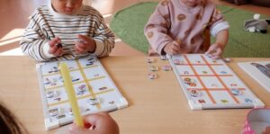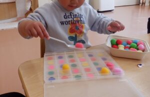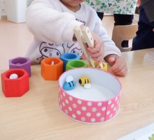 指先遊びのおもちゃで遊んでいた、むーんさん!手作りのおもちゃもたくさんあって、集中して楽しんでいましたよ(^▽^)/楽しく遊びながら、スプーンを下から握ることを覚えたり、同じ絵を見つけてマグネットを貼るという、遊び方を理解したりと子どもたちの真剣な表情と集中して遊ぶ姿が可愛らしかったです!